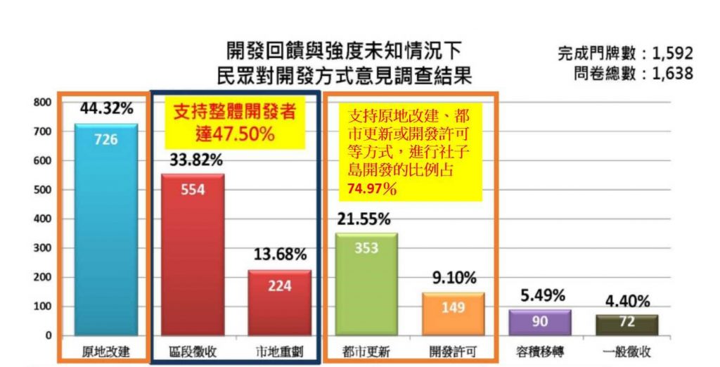 蠻野心足生態協會專職律師郭鴻儀表示,依市府自行調查統計的結果,多數社子島居民傾向以原地改建、都市更新或開發許可等方式,進行社子島開發的比例占74.97%,但市府一直以來均錯誤解讀調查結果,堅持以全區區段徵收方式,進行社子島開發。依據2018年6月26日內政部都審會議紀錄,內政部都委會對於社子島地區都市計畫,即要求市府必須對社子島現有聚落紋理與文化資產保存,應於細部計畫詳加檢討,並在建議事項中建議市府對於社子島已發展地區實施整體開發有困難部分,斟酌考量部分地區剔除於整體開發的可行性。