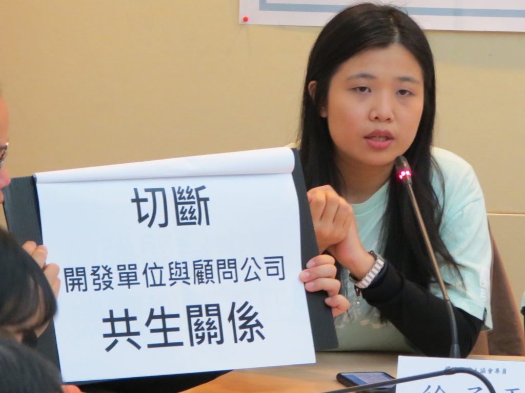 環境法律人協會專員徐孟平表示,環保署應積極檢討改進現行環評法的漏洞,包括老舊環評退場機制、開發單位及顧問公司的共生關係,並強化目的事業主管機關的把關責任(照片提供:環境法律人協會)。